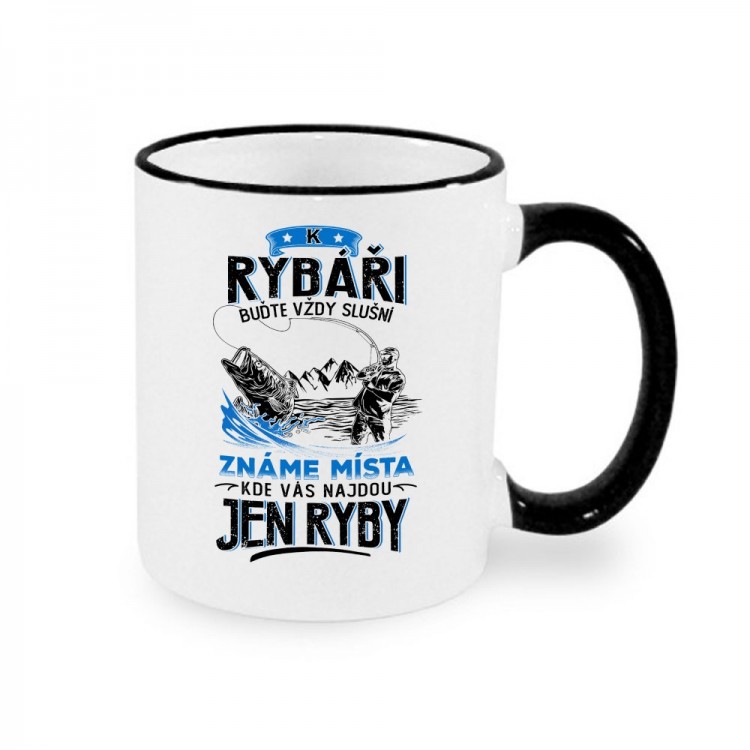 Hrnek nejen pro rybáře s motivem K rybáři buďte vždy slušní, známe místa kde vás najdou jen ryby.
