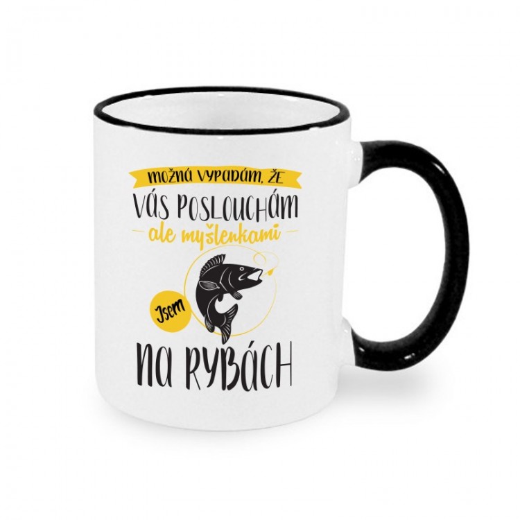 Hrnek nejen pro rybáře s motivem Možná vypadá, že vás poslouchám ale myšlenkami jsem na rybách.