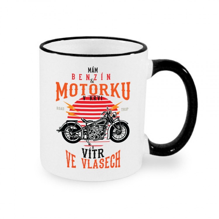 Hrnek pro motorkáře s potiskem Benzín v krvi, vítr ve vlasech.