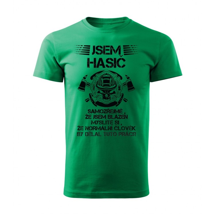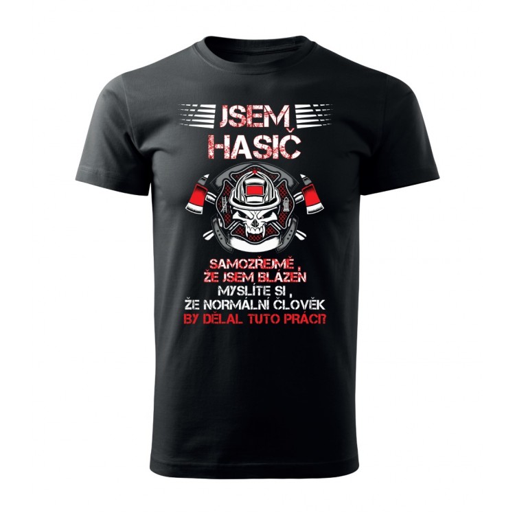 Tričko s potiskem Jsem hasič, samozřejmě, že jsem blázen. Myslíte si, že normální člověk by dělal tuto práci?