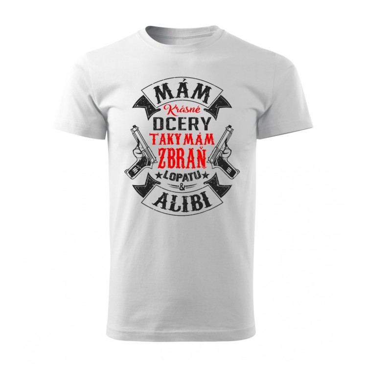 Pánské tričko s potiskem Mám krásné dcery, taky mám zbraň, lopatu a alibi. Správný dárek pro každého správného tátu.