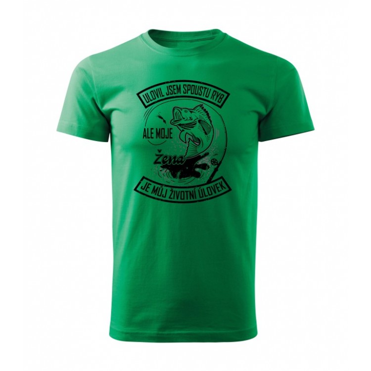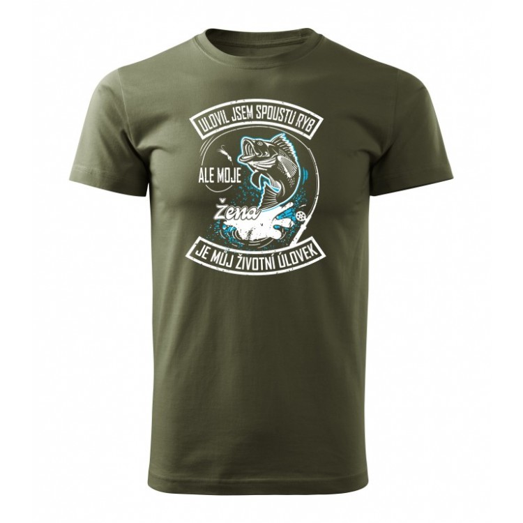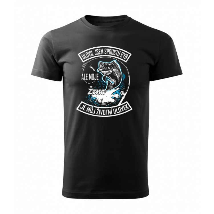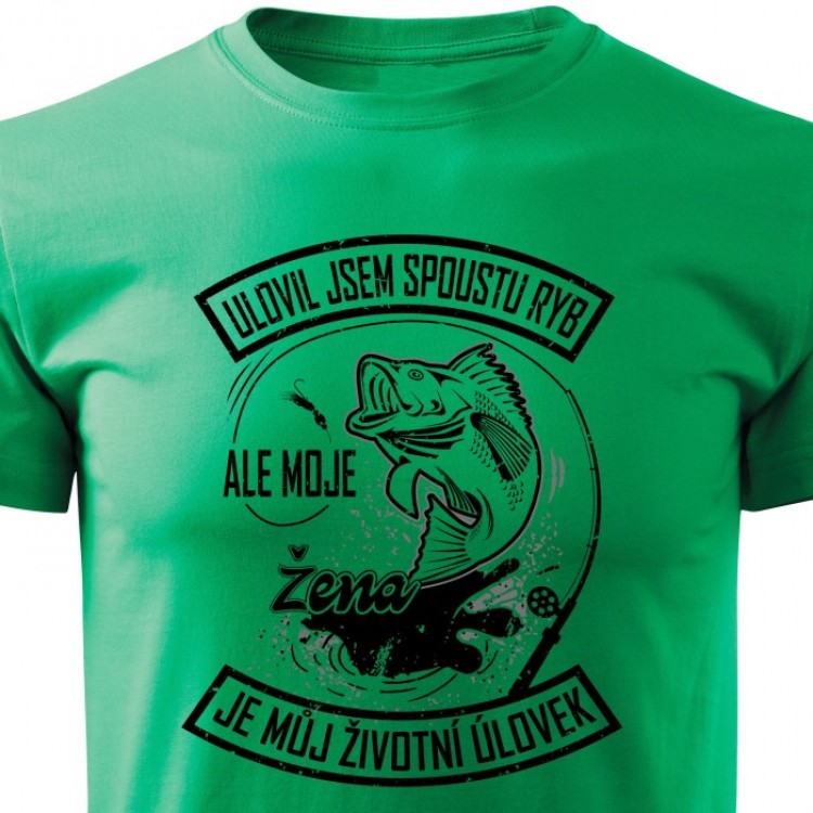Tričko s potiskem Ulovil jsem spoustu ryb ale moje žena je můj životní úlovek.